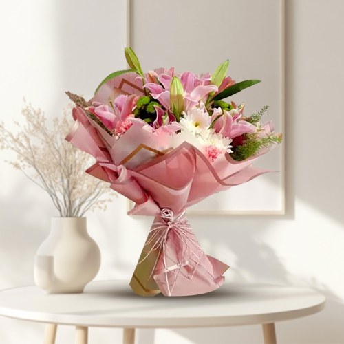 This 2ft tall arrangement is made of: � 5 Pink Oriental Lilies � Wrapped with a Tissue