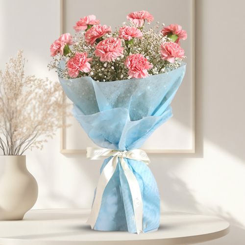 Our Cotton Candy Carnation Delight bouquet showcases 10 enchanting baby pink carnations in a delightful arrangement. Each bloom is lovingly complemented with stylish fillers, adding depth and beauty. Wrapped in a chic non-woven printed blue paper, this bouquet has a unique flair that sets it apart. The soft pink of the carnations offers a comforting, cheerful vibe that resonates with love and friendship. Perfect as a gift for anniversaries, graduations, or just to brighten someones day, it conveys heartfelt emotions effortlessly. These flowers symbolize admiration and sweetness, making them a timeless choice. With vibrant colors and fresh scents, they can brighten up any room, whether at home or in the office. This bouquet doesnt just look good; it feels good to give. Impress your loved ones, and let them know you�re thinking of them with this thoughtful gesture. Its unpretentious beauty makes it suitable for any occasion, ensuring happiness is always delivered. As a treat for yourself or for someone special, its bound to bring joy. It�s not just flowers; it�s a heartfelt message wrapped in love.