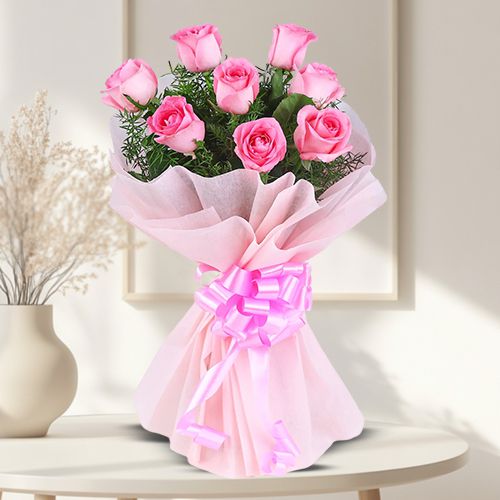 Experience the serene beauty of our Delicate Rose Charm bouquet, which radiates love and joy. This stunning arrangement features 8 delicate roses, each chosen for its lush blooms and fresh appearance. The delightful Delhi Asparagus fillers enhance the overall charm, adding a touch of greenery that perfectly complements the roses. Carefully wrapped in gentle pink tissue paper, this bouquet makes for a lovely gift for anniversaries, birthdays, or any special moments. Its not just a bouquet; it�s an expression of your feelings! Ideal for surprising someone special, it brings a smile and brightens any space. Share the magic of flowers with this enchanting arrangement that speaks volumes of love and affection.
