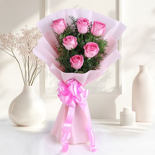 This flower bouquet contains: � 6 Baby Pink Roses with Green Asparagus Fillers � Wrapped with Pink Tissue