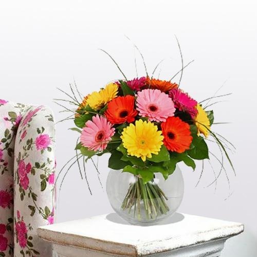 These bright 12 assorted colours of gerberas will make all smile with love. ( vase may vary ).