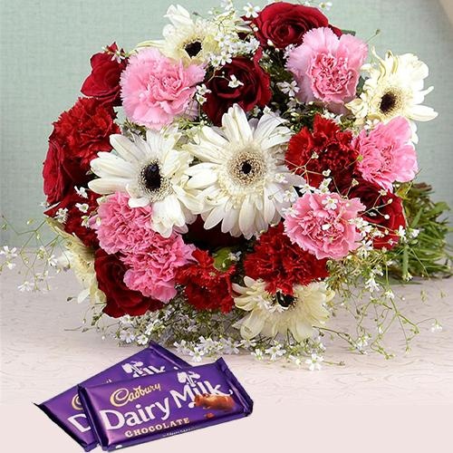 Present this Rhapsodic Blossom Olio to your adored ones and fill their hearts with florid ecstasy. This Olio presents a Psychedelic Alloy of 5 Roses, 3 Carnations and 2 Gerberas allied together by a Chic Ribbon and garnished with Petite Fillers with 2 Dairy Milk Chocolate.