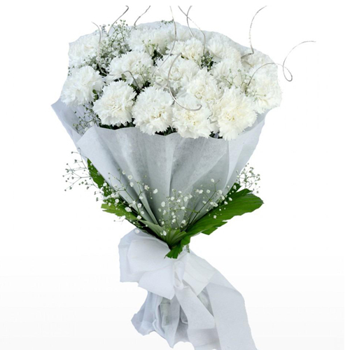 Show love and respect to someones who is no more by sending this attractive Bouquet of Twelve White Carnations, wrapped by a tissue with and share the moment with their family members.