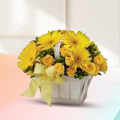 Present this Nurtured Novelty Gerberas and Roses Arrangement to your elder brother on his 40th birthday and thus convey to him your hearty acknowledgement of his ever-encouraging patronage behind your endeavors. This Collection flaunts a heart-pleasing Gathering of appealing 5 Yellow Gerberas and cheering 15 Yellow Roses. (Basket May Vary)