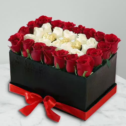 Love is best expressed by sending this Delightful Love Duet of 30 pc Red n White Roses with 3 pcs Ferrero Rocher to your near and dear ones.