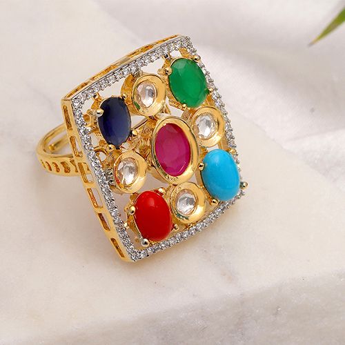 Adorn your fingers with this exquisite Navratan Kundan Ring, designed with a beautiful mix of nine stones, each representing different celestial influences. The traditional Kundan craftsmanship brings these stones together in a mesmerizing arrangement, reflecting an age-old legacy of elegance and charm. Whether youre dressing up for a wedding or adding an eye-catching piece to your everyday look, this ring is sure to impress. Blending rich colors and symbolic value, its a must-have for those who appreciate cultural sophistication and stunning jewelry. Remember to spot-clean, store separately, and shield from moisture and fragrances to maintain its stunning appearance.