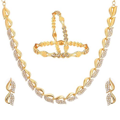 This gift box contains: � Gold Plated AD Necklace � A Pair of Matching Earrings � Bangles