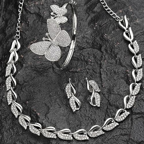This gift box contains: � An AD Studded Leaf Shaped Necklace � A Pair of Matching Earrings � A Butterfly Shaped Bracelet
