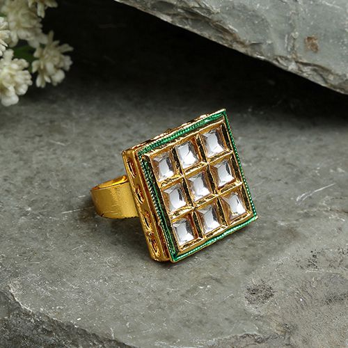 Marrying the traditional with the modern, this charming Kundan ring features a beautiful Kundan stone nestled in an exquisitely designed band. Its enchanting sparkle brings a touch of opulence to any attire, whether for significant celebrations or casual engagements. The essence of Kundan craftsmanship is captured in its detailed artistry and radiant stone. The ring�s adaptable design ensures it effortlessly elevates your look, adding a refined touch. To retain its pristine beauty, store the ring separately and avoid exposing it to water and strong fragrances. A gentle spot-clean will help maintain its luster and detail. This ring is not merely a piece of jewelry; it�s a symbol of lasting elegance and superior craftsmanship, ready to be treasured for years to come.