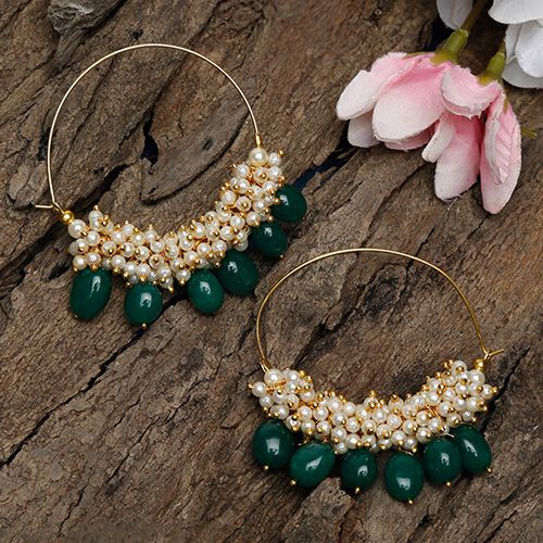 Introducing the Pearl Enchantment Hoops, a seamless blend of classic elegance and modern charm. These hoops are adorned with glittering emerald stones set against a backdrop of lustrous pearls, making them a perfect accessory to elevate any ensemble. The rich green hue of the emeralds adds a luxurious touch, while the pearls lend an air of sophistication. Ideal for festive events, formal occasions, or adding a touch of elegance to your daily wardrobe, these earrings are versatile and stunning. Keep your hoops looking pristine by spot-cleaning them and storing them separately to avoid scratches. Avoid contact with perfumes and water to preserve their brilliance. The Pearl Enchantment Hoops are a must-have for any jewelry enthusiast looking to add timeless pieces with a contemporary twist.
