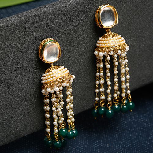 Step into timeless elegance with these ethereal Kundan earrings. Expertly crafted, each earring features gleaming Kundan stones nestled in a gold-plated setting. Perfect for both casual wear and special occasions, their classic design transcends trends. The delicate craftsmanship evokes traditional artistry while embracing a contemporary flair. Lightweight and easy to wear, they bring a touch of refinement to any ensemble. These earrings are not just accessories but an expression of a sophisticated style. Ensure they remain pristine by spot-cleaning, storing them separately, and keeping them away from perfumes and moisture. Add these timeless Kundan earrings to your collection for a touch of radiant elegance.