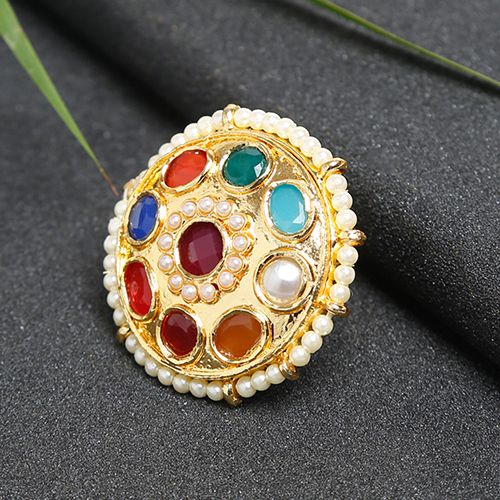 Embrace the vibrant allure of the multicolor Kundan ring, an exquisite addition to your accessory lineup. This stunning ring features an eclectic mix of Kundan stones, each in a different brilliant color, set within a beautifully detailed gold-plated frame. The multicolor arrangement creates a lively, eye-catching piece perfect for making a statement wherever you go. Ideal for festive events or adding a touch of whimsy to your daily attire, this ring exudes both sophistication and playful charm. For longevity, ensure to spot-clean, store it in a separate box, and keep away from perfumes and water. This multicolor Kundan ring will undoubtedly become a treasured piece in your jewelry collection, radiating beauty and joy with every wear.