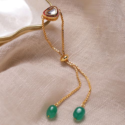 Elevate your jewelry collection with this stunning Green Kundan Charm Bracelet, a perfect fusion of elegance and tradition. The gold-plated brass base is beautifully adorned with vibrant green Kundan stones, offering a luxurious touch. This bracelet is designed to complement various outfits, from casual to formal, making it incredibly versatile. The intricate detailing and contemporary style make it a standout piece, perfect for any occasion. To maintain its beauty, store the bracelet in a separate box and avoid contact with water and perfumes. A thoughtful gift for someone special, this bracelet embodies grace and sophistication.