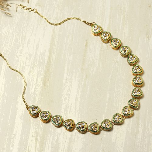 The Kundan Choker is a masterpiece of design and artistry, boasting a series of meticulously set Kundan stones that glimmer with every movement. The intricate arrangement of stones adds a layer of depth and sparkle, transforming any outfit into a statement look. Its blend of traditional craftsmanship and modern style makes it suitable for both classic and contemporary wardrobes. Perfect for weddings, parties, and other special events, this choker is a timeless accessory crafted from high-quality materials ensuring it remains a staple in your collection. Maintain its brilliance by storing it in a jewelry box and keeping it away from potential damage from harsh chemicals and moisture.