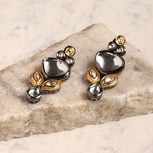 Unveil your inner elegance with the Dual Tone Polki Earrings. Expertly designed, these earrings combine timeless Polki stones in a stunning dual-tone arrangement. Whether dressing up for a formal event or adding flair to your festive outfit, these earrings deliver a sophisticated charm that stands out. The intricate detailing elevates their visual appeal, crafted to perfection with high-quality materials ensuring they maintain their beauty over time. Keep them in a soft-lined jewelry box and away from moisture to preserve their captivating shine.