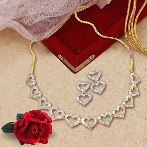 A perfect gift, this two tone plated necklace set is designed with heart shaped motifs & Rhinestones in pave setting