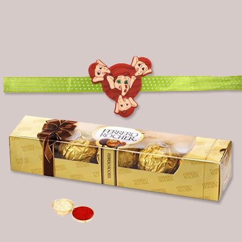 This is a gift of : � Ganesha Kids Rakhi � 4 pc Ferrero Rocher Chocolates � Free Roli Tilak n Chawal � A free Rakhi card with personalized message.