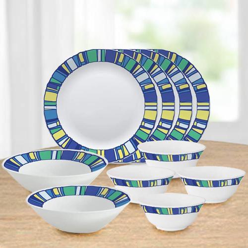Make occasions grander with this Stylish Larah by Borosil Tiara Series Opalware Dinner Set and share the moment with your loved ones. Details: 1. Brand: Larah by Borosil 2. Color: White n Sapphire 3. Material: Opalware 4. No. of Pieces: 10 pcs 5. Product Type: Dinner Set 6. Country of Origin: India 7. Other Features: Made of toughened glass, dishwasher and microwave safe and chip resistant. 8. Package Contents: 4 piece 11 inch Full Plate, 4 piece 4.5 inch Veg Bowl and 2 piece 6.5 inch Multi Purpose Bowl.