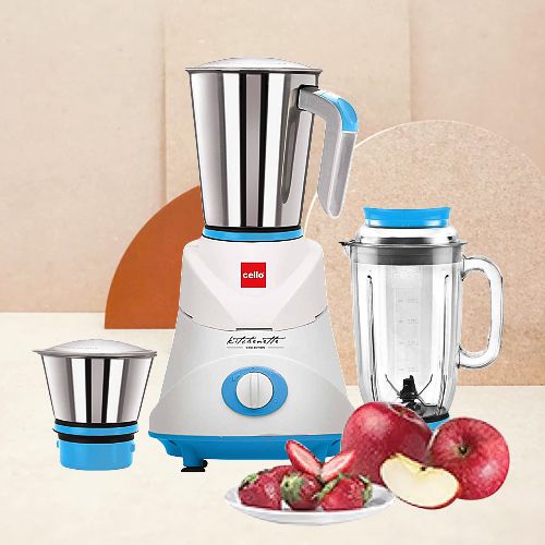 Try out something special by sending this online gift of Lovely Cello 3 Jars Juicer Mixer Grinder in Blue. This product has the following features: Details: 1. Product: Juicer Mixer Grinder 2. Brand: Cello 3. No. of Jars: 3 4. Material: Plastic Body, Steel Jars, Plastic Jars 5. Color: Blue 6. Wattage: 500 W 7. Country of Origin: India 8. Warranty: 1+1 year on product.