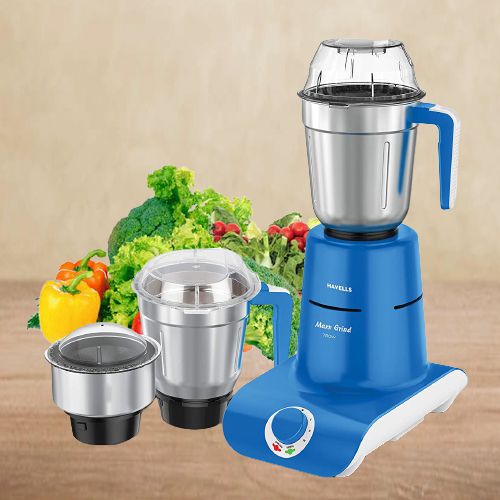 Splash liveliness into the lives of the people you care about by gifting this Fantastic Havells Blue Color Mixer Grinder with Overload indicator that helps instantly rejuvenate the mood. This product has the following features: Details: 1. Product: Mixer Grinder with Overload indicator 2. Brand: Havells 3. No. of Jars: 3 4. Material: Stainless Steel 5. Color: Blue 6. Wattage: 750 Watts 7. Voltage: 230 Volts 8. Is Dishwasher Safe: No 9. Number of Speeds: 3 10. Country of Origin: India