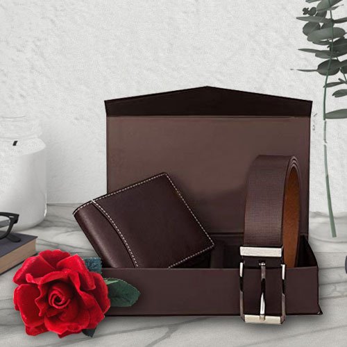 Please the gentleman you esteem by gifting him this Attractive Combo of Wallet and Belt. Crafted out of standard Brown Leather and arranged in a deft Black Box, the Wallet and the Belt are sure to please hearts. (Free Velvet Red Rose)