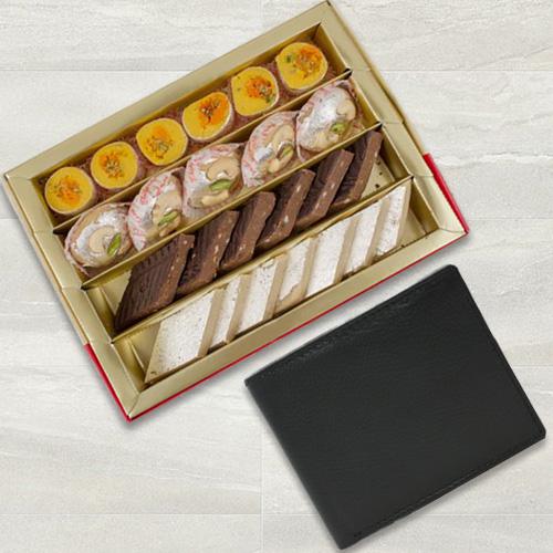 Deliver happiness by sending this Tasty Bhikarams Assorted Sweets (gross wt. 500 gm) with a Black Colour Gents Leather Wallet from Rich Born having multiple card slots n a coin pocket to make others happy.