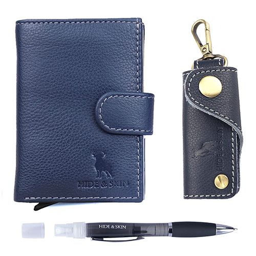 Convey your heartfelt wishes by gifting this Lovely Hide N Skin Leather Card Case with Pen N Keychain Set to the people dearest to you. Product Details: 1. Product Content: Unisex Card Case with Pen N Keychain Set 2. Brand: HIDE N SKIN 3. Color: Navy 4. Material: Leather 5. Style: Card Holder 6. Special Feature: RFID Blocking 7. Country of Origin: India