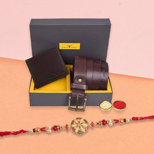 This gift combo contains: � A Kundan Rakhi by Rakhi Sutra (KPRK0313) � Urban Forest Leather Wallet N Belt Combo (Brown) � Complimentary Roli Tika N Chawal � Complimentary Message Card with Free Rakhi