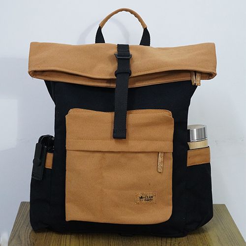 This is a gift of an eco-friendly Armadillo Backpack by Clan Earth, featuring a stylish combination of Black and Brown. Crafted from sustainable, high-quality military-grade water-resistant canvas, this backpack is designed for adventurers and travelers. Its rolltop design expands by 5 liters, offering ample storage capacity. It includes a dedicated section for laptops up to 15.6 inches, wide pockets on both sides, and practical features like an easy-access outer front pocket, inner zipped pockets, and open pockets on the laptop section for organizing essentials. Additional details such as a key clip and sunglasses loop add functionality. To preserve its quality, gently spot clean with cold water and mild soap, air dry away from direct sunlight, and store in a dust bag when not in use.