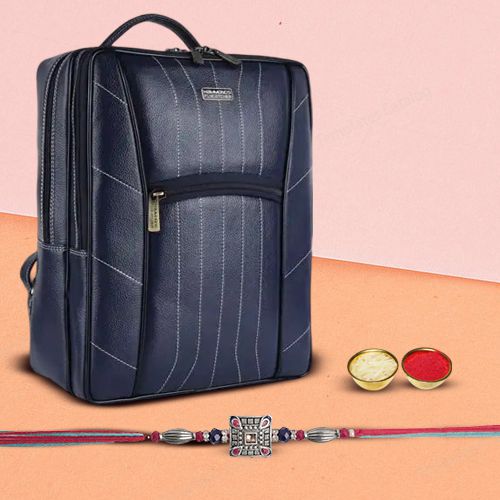 This gift combo contains: � A Kundan Rakhi by Rakhi Sutra (QUR7866Y) � Leather Laptop Backpack (Blue, Fits up to 16 Inch Laptop) � Complimentary Roli Tika N Chawal � Complimentary Message Card with Free Rakhi