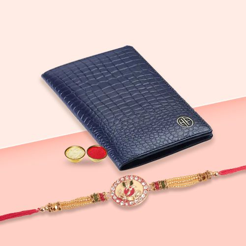 This gift combo contains: � An AD Kundan Rakhi by Rakhi Sutra (PRRK8143) � Leather Travel Passport Holder (Croc Blue, RFID Protected) � Complimentary Roli Tika N Chawal � Complimentary Message Card with Free Rakhi