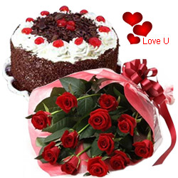 12 Red Rose Bunch with 1/2 Black Forest Cake