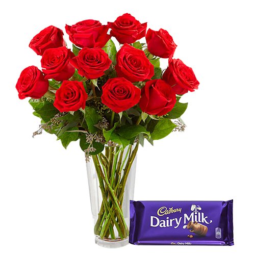 MidNight Delivery ::Exclusive Dutch Red Roses in Vase with free Cadburys Chocolate
