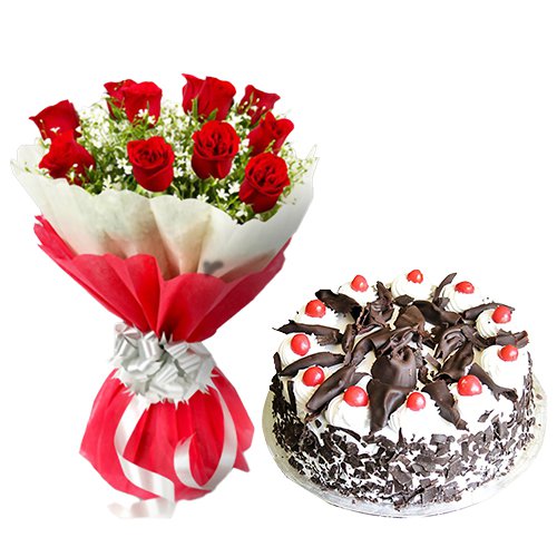 12 Red Roses with Black Forest cake 1 Kg from 5 star Hotel Bakery