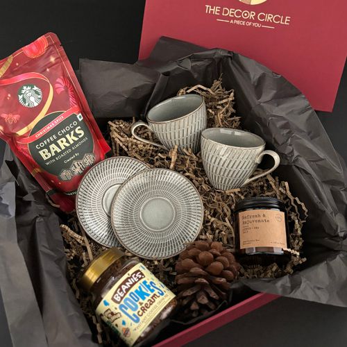Elevate the joy of housewarming with our Elegant Espresso Gift Bundle, designed to make new spaces feel like home. The set includes two exquisite ceramic espresso/green tea cups with accompanying saucers, pairing versatility with elegance. To energize the days ahead, a jar of premium instant coffee is included, promising rich flavors with each cup. For a sweet compliment, enjoy a packet of chocolate almond bark that satisfies even the most sophisticated palates. A fragrant glass candle jar rounds off this thoughtful gift, filling the space with a soothing aroma that speaks of peace and comfort. Gift luxury and warmth in one perfect package.