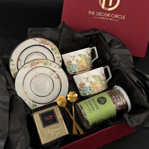 This is a gift of: � A set of 2 bone china cups and saucer � A box of tea (choose from kahmiri kahwa/ peppermint/ morrocon tea) � A set of 2 brass teaspoons � A box of organic healthy cookies