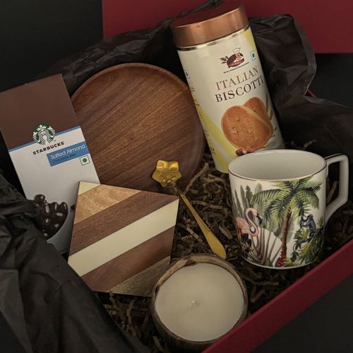This is a gift of: � A wooden snack plate - 6 inch � A porcelain enamelled Mug � A box of chocolate covered almonds � A teaspoon � A set of 2 wooden coasters � A box of cookies/biscuits � A coconut shell candle