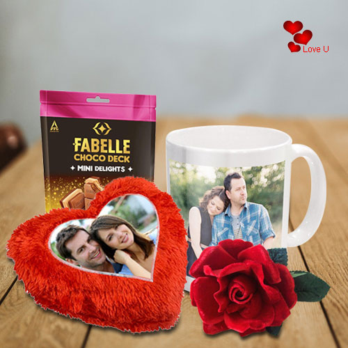 Squeeze your love into the hearts of the people you love by gifting them this Exciting Personalized Gifts with Chocolates for Valentines Day consisting of - a) A Personalized Coffee Mug b) A Personalized Heart Shape Cushion c) A Pack of ITC Fabelle Choco Deck Mini Delights (163 gms) d) A Red Velvet Rose