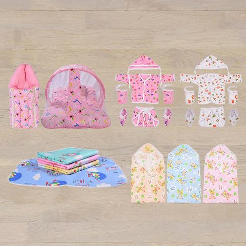 Convey your special wishes with this Exclusive Gift Set for New Born Baby as you enhance happiness in the lives of your toddler. The details are as under: 1. Items: 18 Pcs Gift Set containing 2 Dresses, 2 Pants, 2 Caps, 2 Socks, 2 Mittens, 4 pcs Plastic Sheet, 3 pcs Baby Cover, 1 Bed Set 2. Age: Ideal for 0-6 Months 3. Fabric Type: Cotton