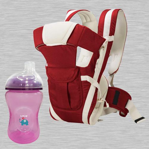 Bring your child whom you love closer to your heart by gifting this Exclusive LuvLap Jumbo Sky Sipper N Baby Carrier Cum Kangaroo Bag loaded with your affection and fondness for them. The details are as follows: 1. Items: LuvLap Jumbo Sky Sipper and 4-in-1 Adjustable Baby Carrier Cum Kangaroo Bag 2. Brand: LuvLap 3. Age Group: 6 Month+ 4. Color: Pink (Sipper), Maroon (Baby Carrier) 5. Material: Plastic (Sipper), Cotton (Washable-Baby Carrier) 6. Other Features: BPA free, non toxic, food grade sterilizable and dishwasher Safe