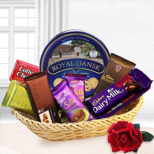 Make your dear one happy by sending thisGraceful Festive Carnival Chocolate Hamper with your special feelings. This Chocolate Hamper Basket includes Danish Assorted Cookies, Cadbury Diary Milk Silk, Temptation, Cadbury Diary Milk Roast Almonds, Cadbury Diary Milk Fruits N Nuts, Chocopie. (Free Velvet Red Rose)