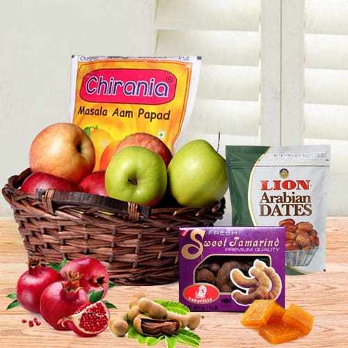 Order online this gift of Precious Dress To Impress Fruit Gift Hamper for your special one and show your love and affection. This lavish array of Festive family favorites comes with Sweet Tamarind, 1 kg. of Dates, 20 Pieces of Aam Papad Chocolate, 1 kg. of Pomegranate, 1/2 kg. of Pears, 1/2 kg. of Red Apple and 1/2 kg. of Green Apple.