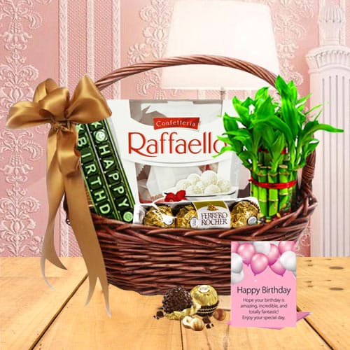 Send your love in the form of this Exciting Birthday Special Gift Hamper to your dear ones for whom you really care. Inside this beautiful Basket, your recipient will discover an enticing arrangement of favorite Birthday treat like 3 pcs Raffello Chocolates, Bamboo Plant 2 tier, Happy Birthday SMS Chocolate, Happy Birthday Card and Ferrero Rocher-4 pcs. These whole items are carefully packed in a Basket with Birthday Party Accessories.