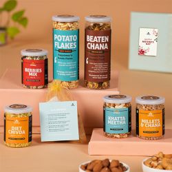 Celebrate Mothers Day by gifting your mother this Enticing Goodies Gift Hamper to paint a happy picture in her heart. This hamper arrives with: 1. 1 Pack of Bhikaram Froot Bite 2. 1 Pack of Bhikaram All in one Chanachur 3. 2 Bars of Cadbury Dairy Milk Crackle(36 gm) 4. 1 Box of 4 Pcs. Ferrero Rocher Chocolate 5. 1 Bar of Cadbury Fruit & Nut Bar(36gm) 6. 1 Pack of Bhikaram Alu Bhujia 7. All the items are beautifully arranged in a Tray