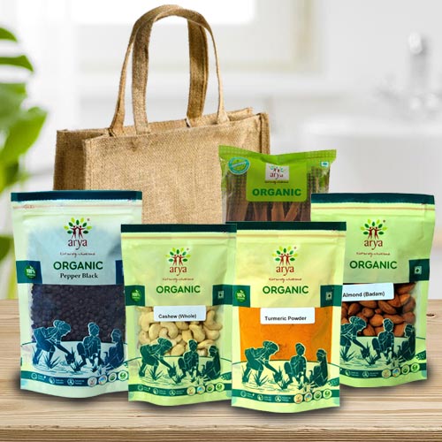 This is a gift of : � Herbal Turmeric Powder (100 gm) � Dabur Honey (50 gm) � Herbal Cinnamon (100 gm) � Organic Whole Black Pepper (100 gm) � Organic Whole Cashew, 100 g � Organic Almonds, 100 g � Reusable Jute Bag