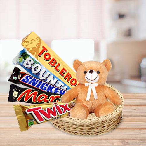 Celebrate with your loved ones as you send online this Marvelous Basket of Chocolates with Teddy and increase happiness in their lives. This Basket is filled with- 1. 1 Toblerone Swissmake 2. 1 Snickers (50 gm) 3. 1 Mars (50 gm) 4. 1 Twix (50 gm) 5. 1 Bounty 6. 1 6 inch Teddy 7. 1 Basket