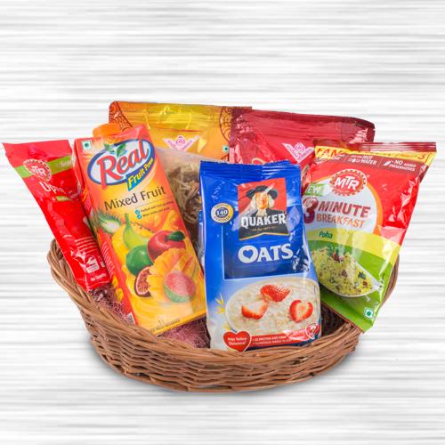 Celebrate with your loved ones as you send online this Captivating Morning Food Hamper and increase happiness in their lives. It contains - a) Real Mixed Fruit Juice (1 Ltr) b) Quaker Oats (400 gm) c) MTR Ready to Eat Upma Mix (170 gm) d) MTR Ready to Eat Poha Mix (160 gm) e) Bhikharam All in One Mixture (200 gm) f) Bhikharam Khatta Meetha (200 gm) g) Bhikharam Bhujia (200 gm) h) Cane Basket