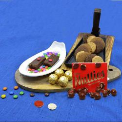 Gift online this Dreamy Cadbury Delight Gift Basket with Glowing Ganesha N Roil Chawal on Bhai Duj and create an extremely joyful moment for your dear ones and shower sisterly love. This Bhaiya Dooj Hamper contains: 1. Cadbury Silk Bubbly (50 g) 2. Cadbury Silk Oreo (60 g) 3. Cadbury Silk Red Velvet (60 g) 4. Cadbury Dairy Milk Fruit n Nut (36 g) 5. Cadbury Dairy Milk Roast Almond (36 g) 6. Cadbury Dairy Milk Crackle (36 g) 7. Cadbury Dairy Milk Bar (13 g x 3 pc) 8. Cadbury Five Star (10 g x 2 pc) 9. A Glowing Ganesh Idol 10. Free Roli Teeka n Chawal 11. A Black Wooden Tray.
