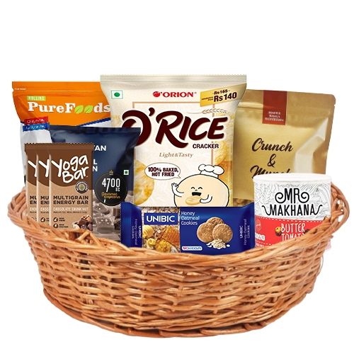 Send online this Fantastic Healthy Delights Gift Basket to your special one and express your love. This gift basket consists of: 1. 3pc Yoga Bar (38 gm each) 2. Unibic Oatmeal Cookies (75 gm) 3. 4700 Popcorn BC Packet (60 gm) 4. Mr. Makhana (50 gm) 5. Pure Foods Banana Chips (142 gm) 6. Crunch N Munch Roasted Masala French Fries (100 gm) 7. Orion Rice Crackers (151.2 gm) 8. A Reusable Cane Basket