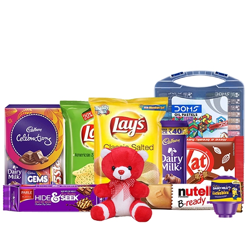 Pick this Delectable Assorted Snacks Cone Hamper with Doms Color Set N Teddy for the dearest people in your life to make them feel special and loved. This gift hamper is loaded with: 1. 2 Different Flavors of Lays Chips (27 gm each) 2. Parle Hide N Seek (120 gm) 3. Cadbury Lickabeles (20 gm) 4. Nestle Kit Kat (37.5 gm) 5. Ferrero Nutella B-Ready (22 gm) 6. Cadbury Mini Celebration (70.2 gm) 7. Cadbury Dairy Milk (52 gm) 8. Doms 25 Shades Color Set 9. Teddy (6 inch)